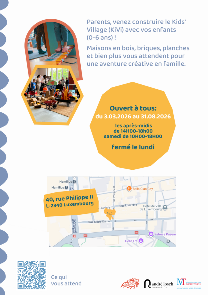Pensé comme un lieu de jeu, d’exploration et de rencontre, le KiVi invite les enfants à manipuler, construire et expérimenter librement à partir d’éléments simples — caisses, planches, briques, brouettes et bien plus — qui deviennent autant de supports pour développer motricité, créativité et coopération.